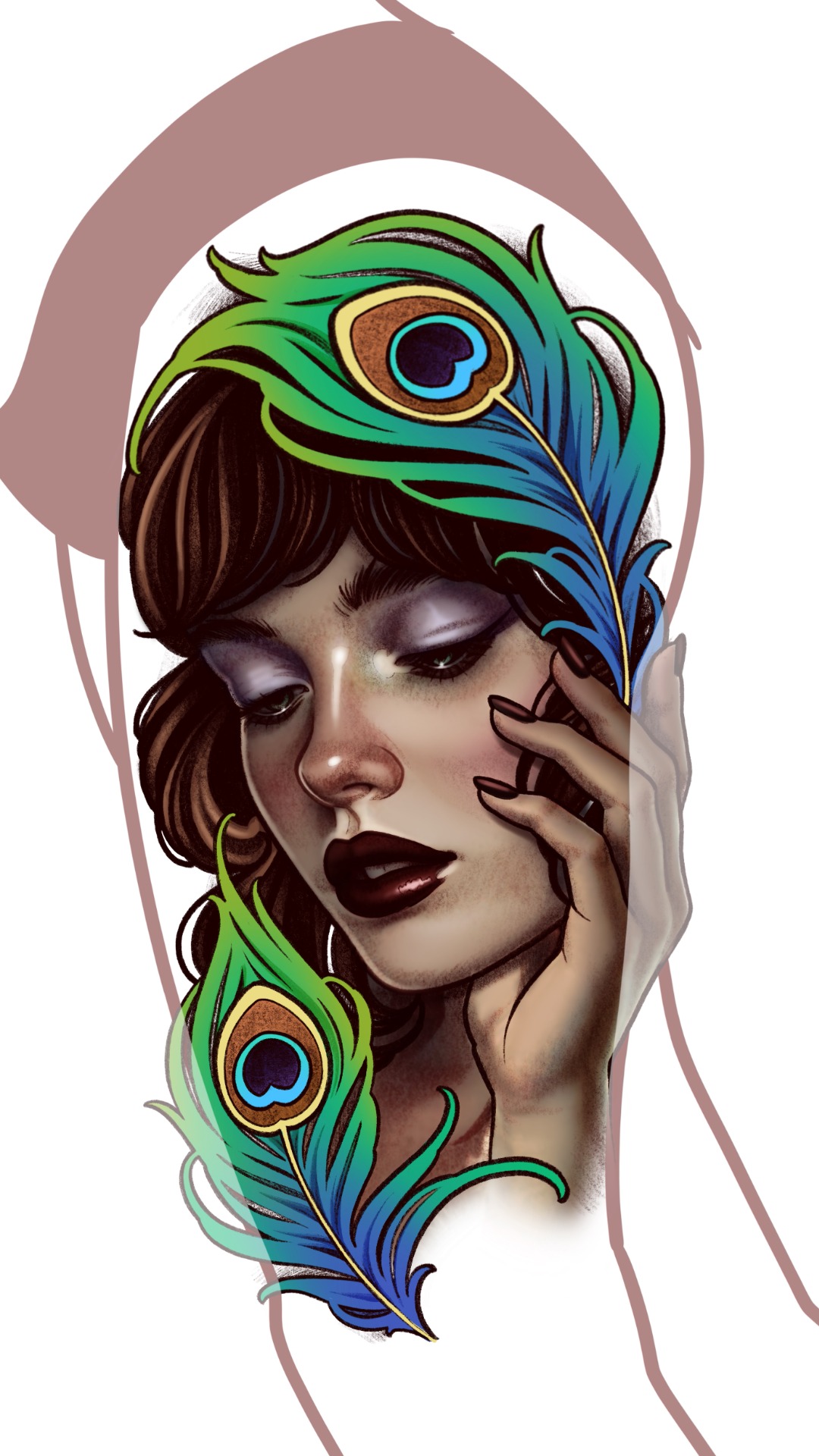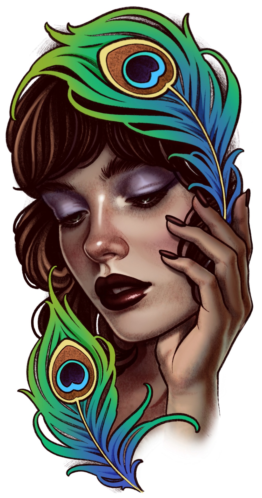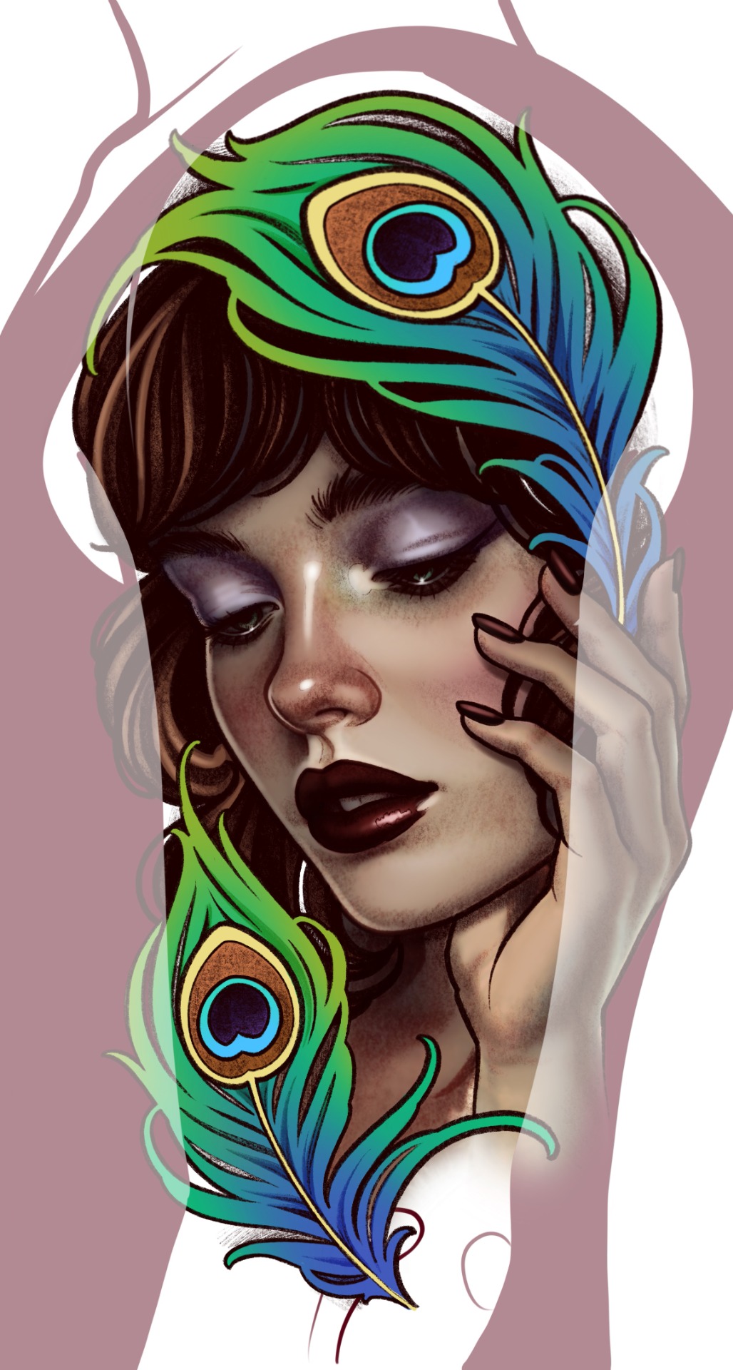 Tässä herkässä mallissa mietteliäs nainen nojaa käteensä riikinkukonsulkien ympäröimänä. Sulkien intensiiviset värit luovat selkeän kontrastin niiden ja synkemmän naishahmon välille. Malli toteutetaan vain värillisenä.