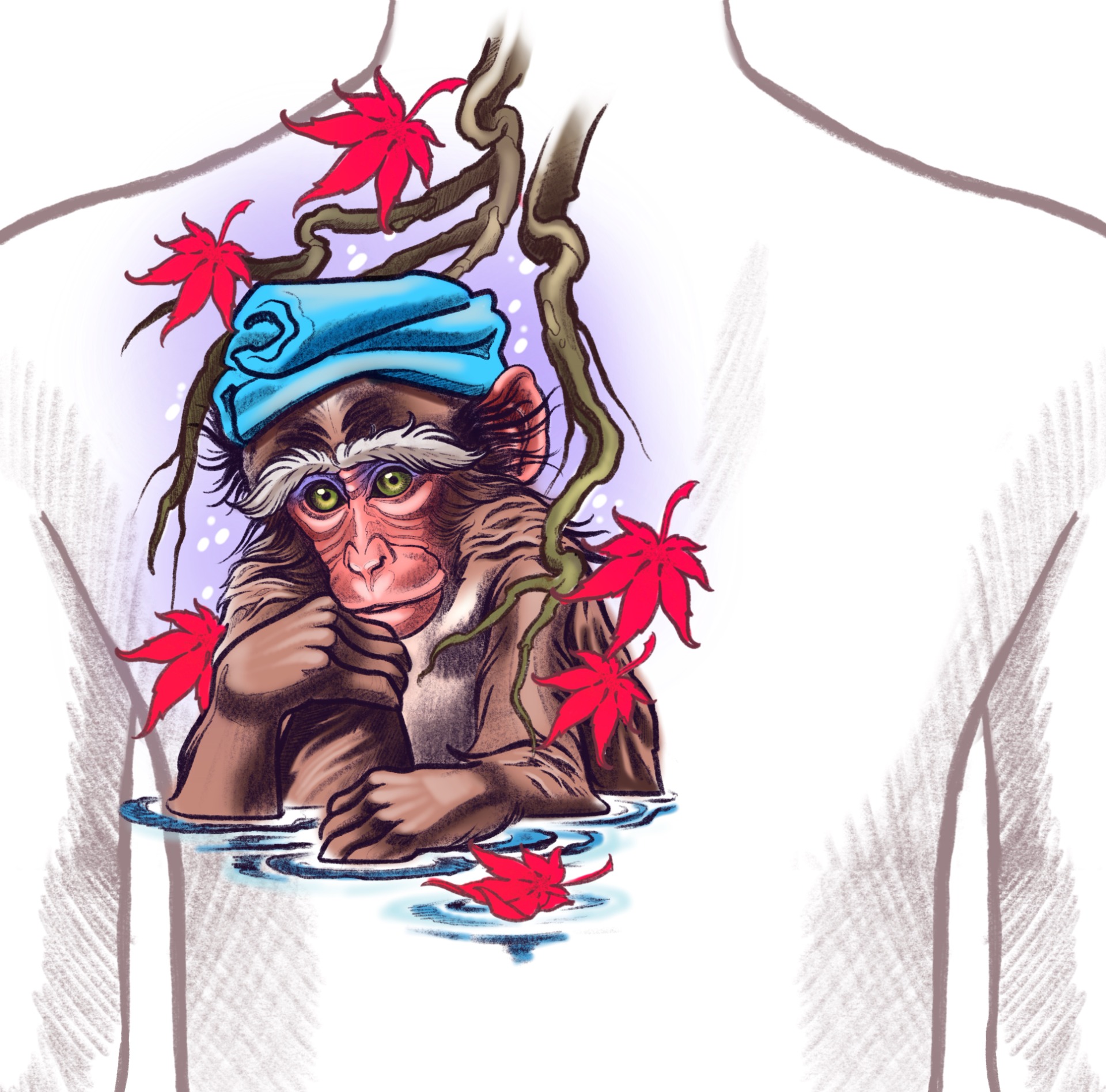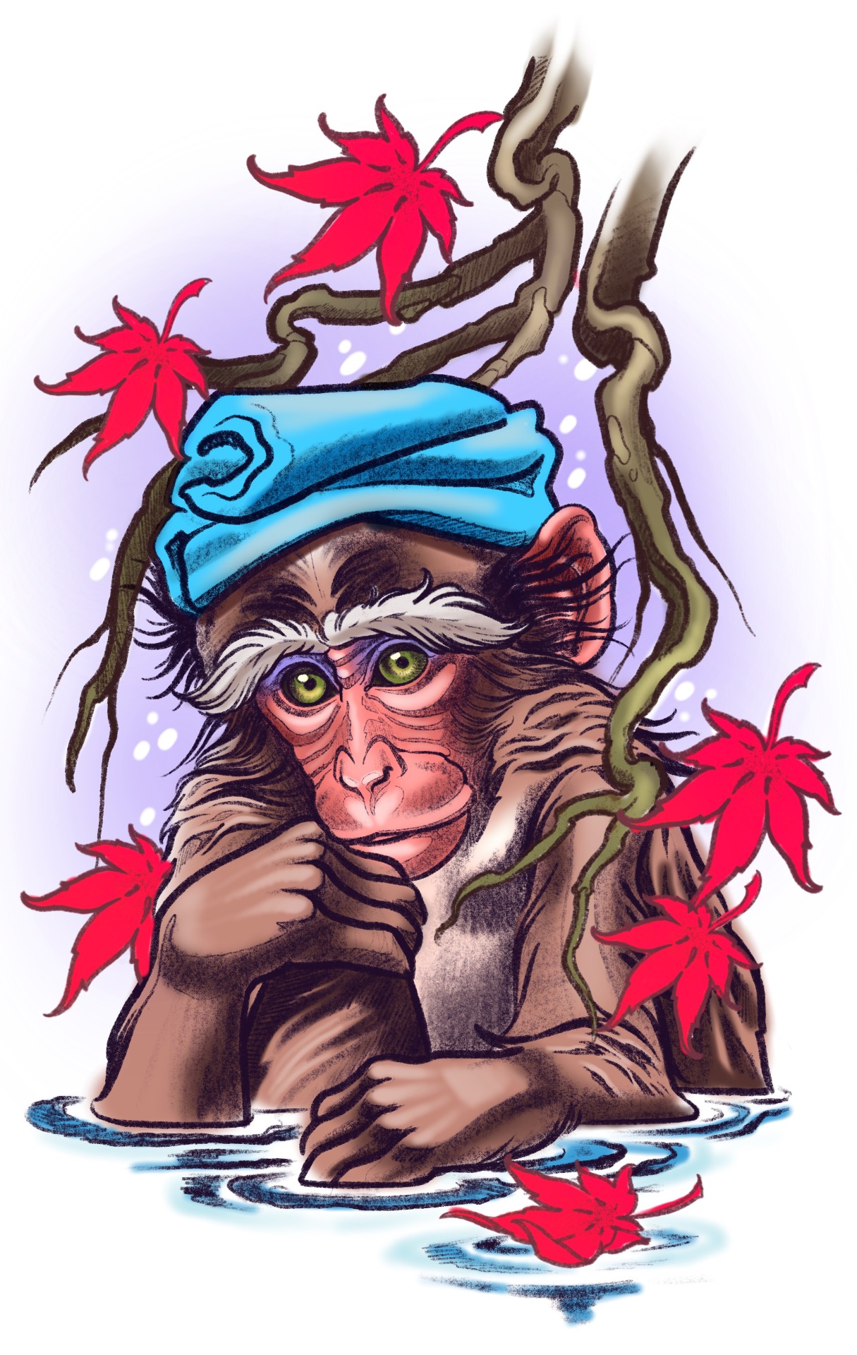 Tässä japanilaishenkisessä kuvassa pieni japaninmakaki istuu kuumassa lähteessä lumisateen keskellä. Malli toteutetaan ainoastaan värillisenä, mutta värejä voidaan muuttaa asiakkaan niin halutessa.